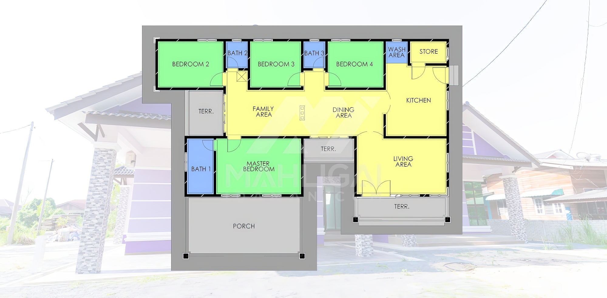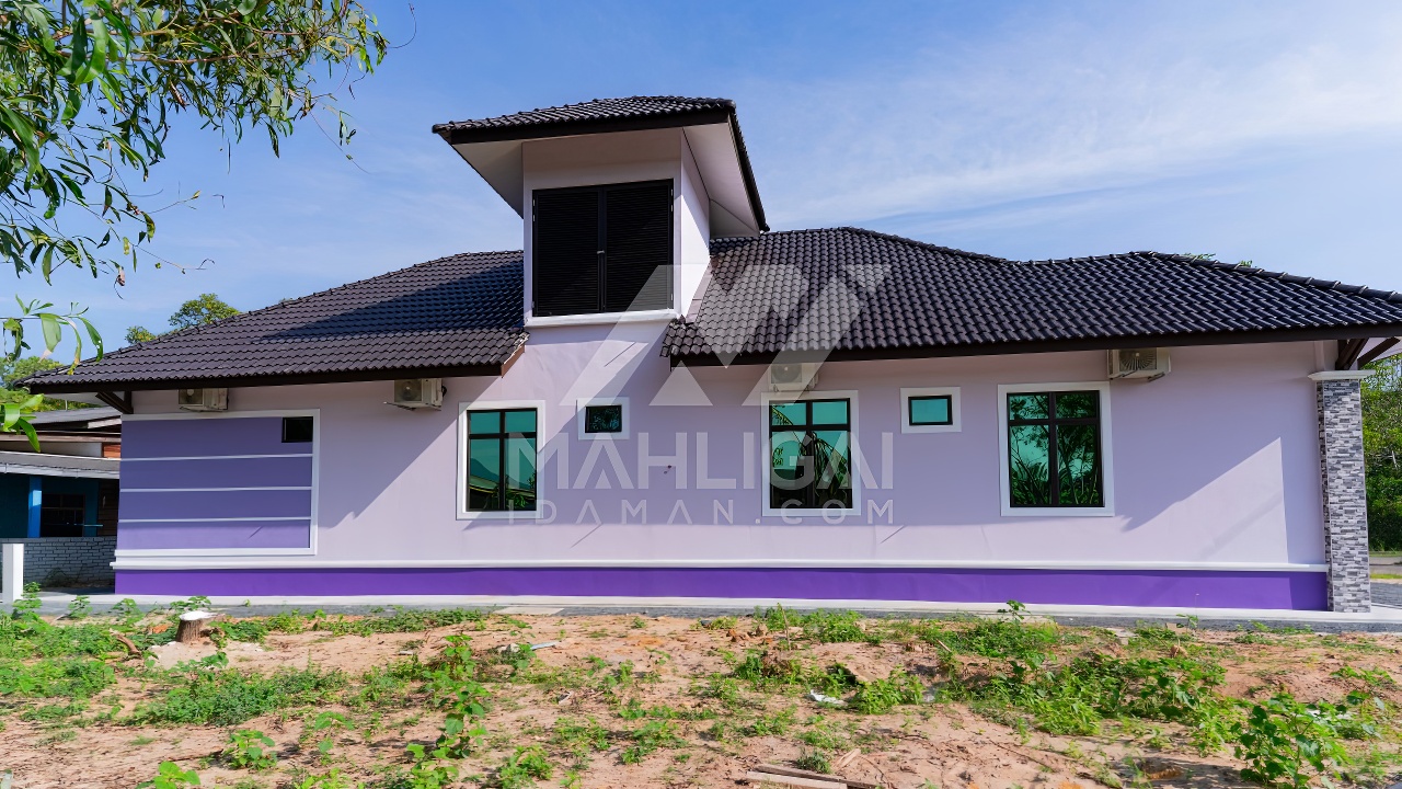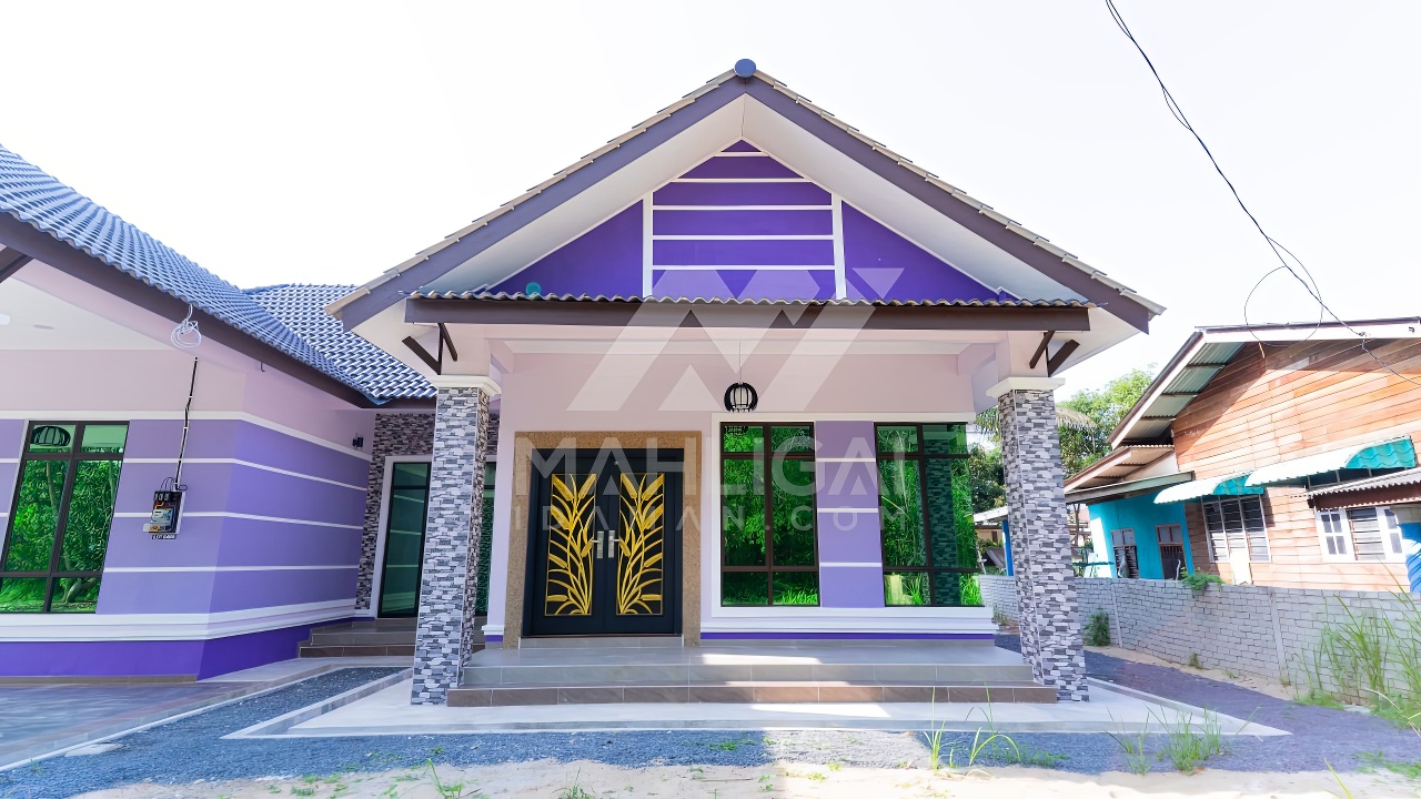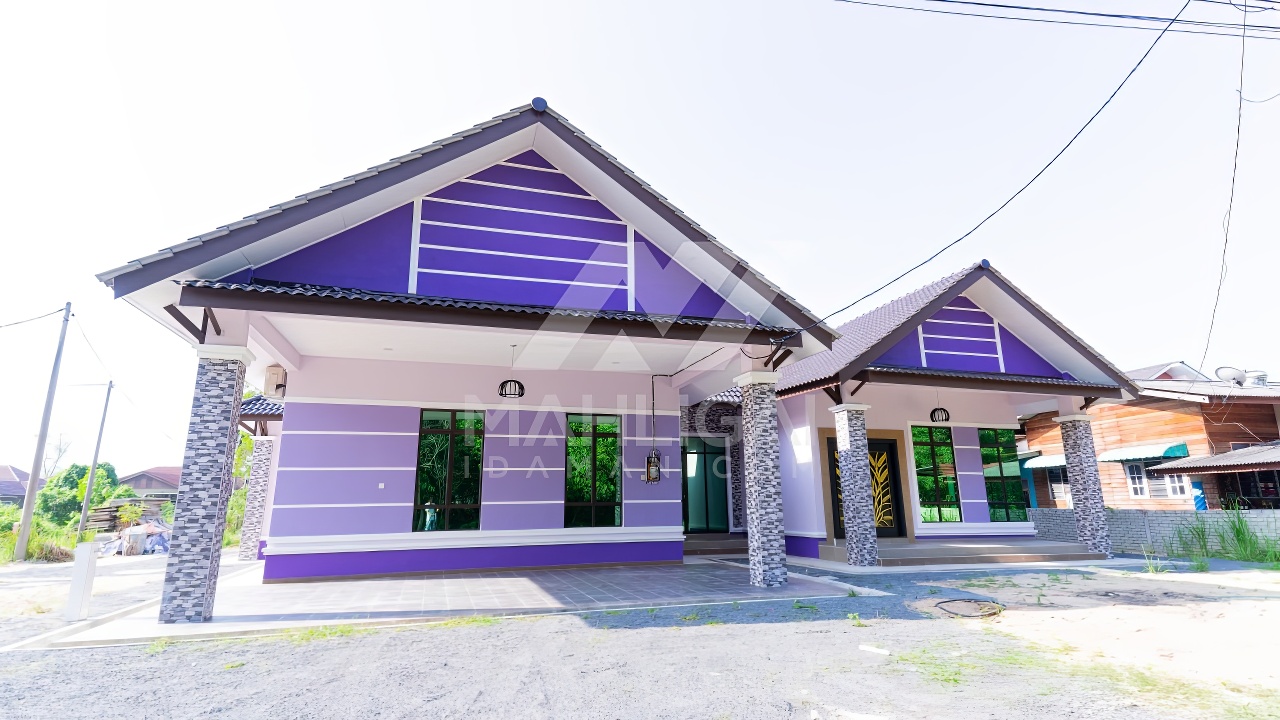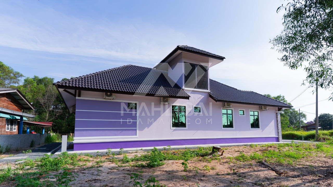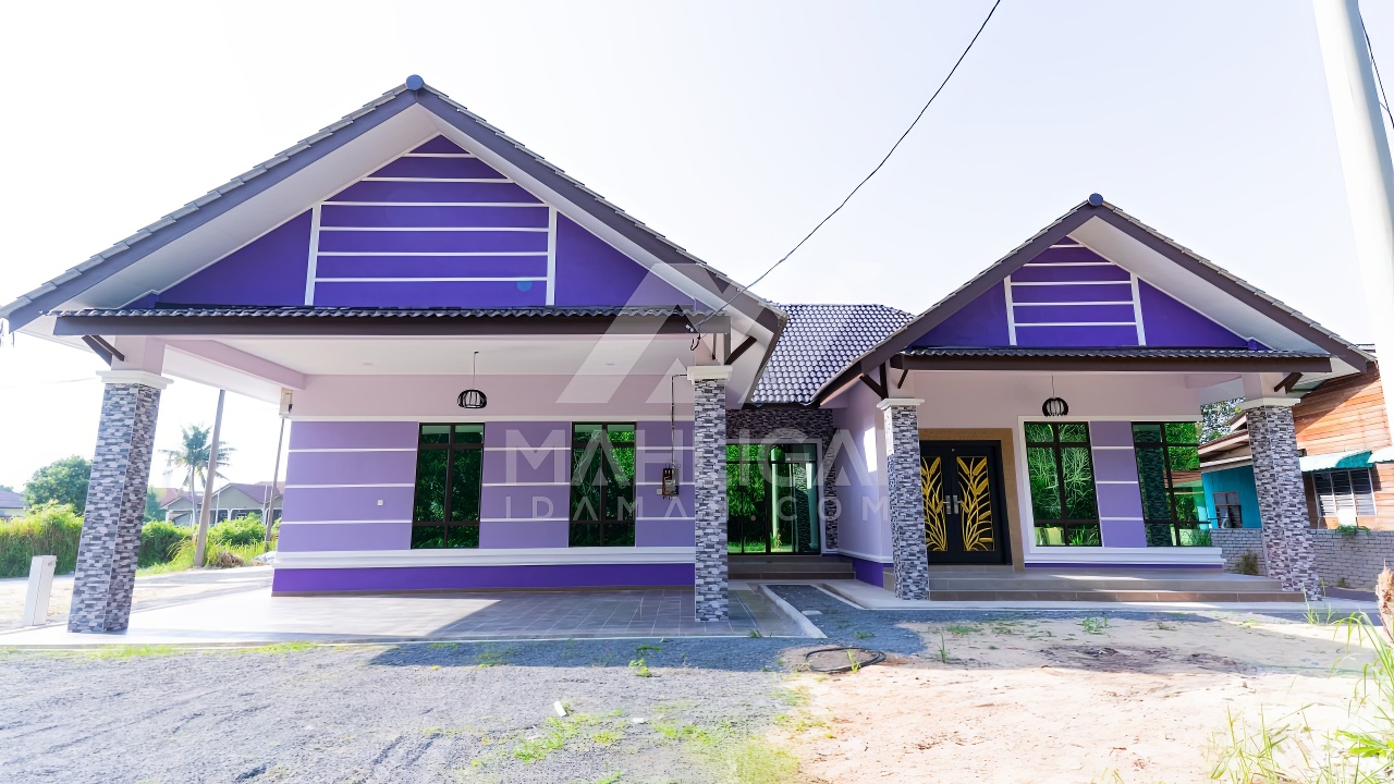 Banglo satu tingkat milik klien kami Puan Fadzilah kini telah siap dibina sepenuhnya di Dungun, Terengganu. Banglo ini dilengkapi dengan empat (4) bilik tidur dan tiga (3) bilik air. Banglo yang berkeluasan 2,106 kaki persegi ini menggabungkan ciri-ciri banglo moden iaitu dari segi rekabentuk dalaman dan luaran yang sangat menarik. Dari segi penggunaan tona ungu dan putih. Bahagian dalam rumah pula mereka memilih warna kuning dan merah jambu menaikan lagi seri dan kemewahan dalam rumah.