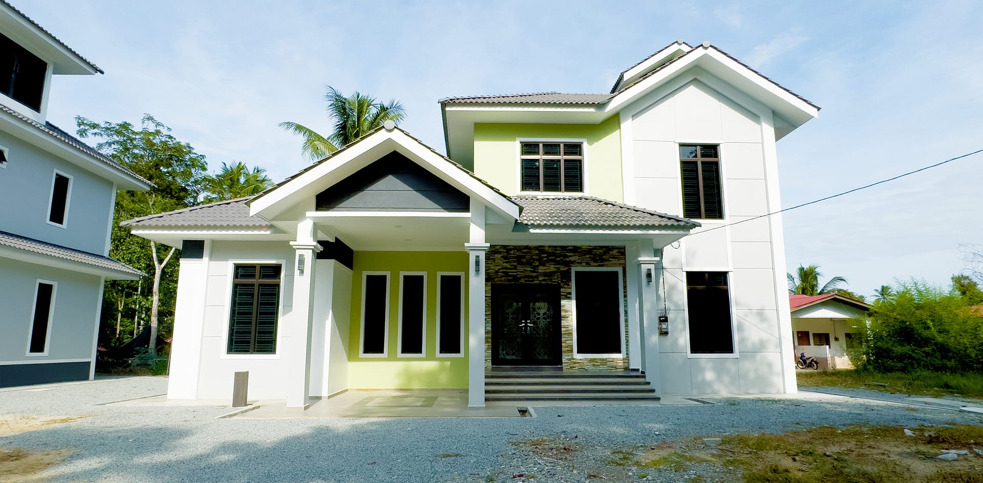 Kini banglo 2 tingkat milik klien kami Puan Harsuzilawati telah siap dibina sepenuhnya di Pasir Mas, Kelantan. Banglo ini dilengkapi dengan empat bilik tidur dan tiga bilik air. Banglo yang berkeluasan 2,098 kaki persegi ini menggabungkan ciri-ciri banglo moden iaitu dari segi rekabentuk dalaman dan luaran yang sangat menarik dari segi penggunaan warna putih dan hijau. Bahagian dalam rumah pula mereka memilih warna putih menaikkan lagi seri dan kemewahan dalam rumah.