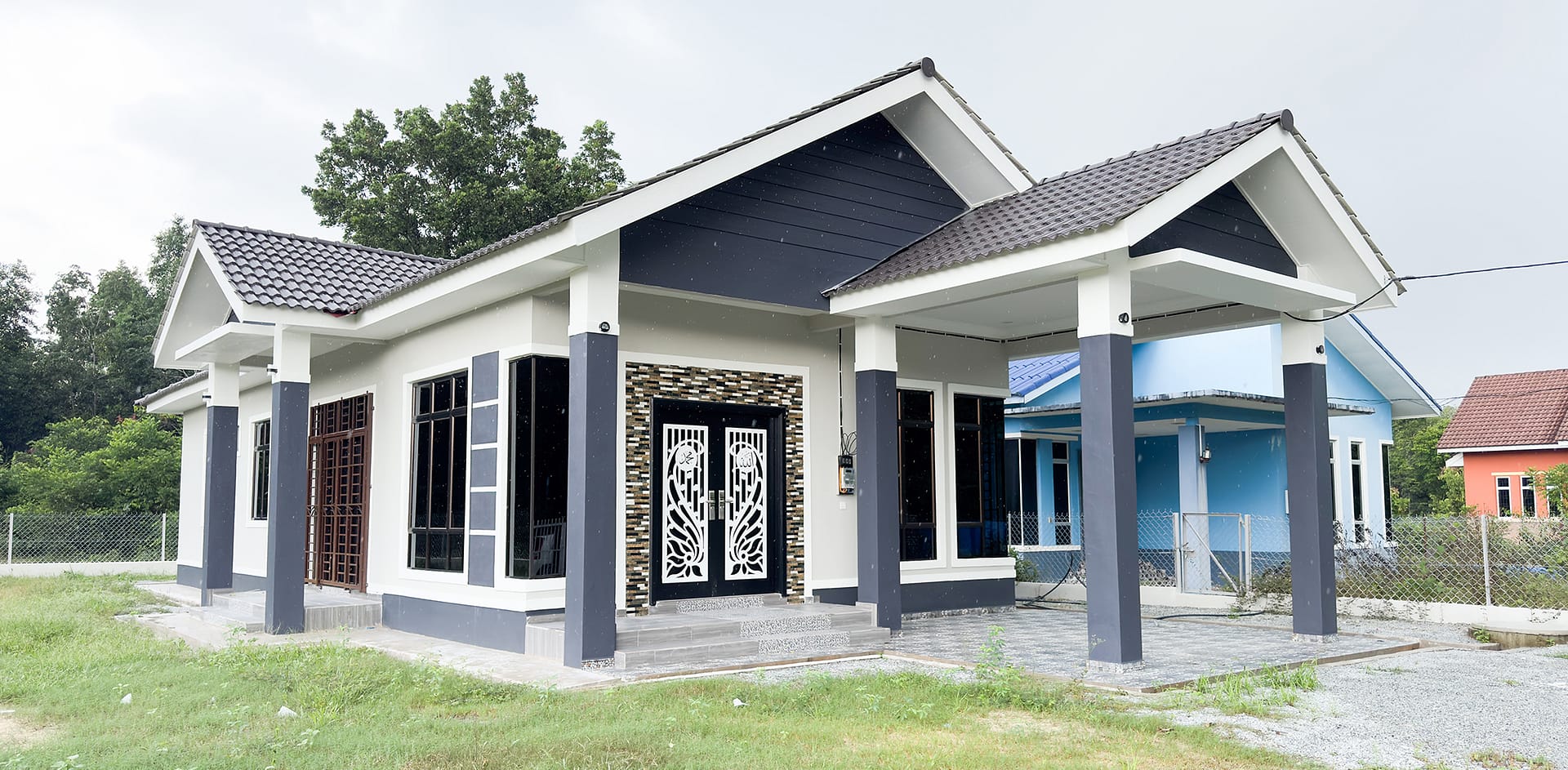 Kini banglo 1 tingkat milik klien kami Puan Farhanis telah siap dibina sepenuhnya di Kg Padang Pak Amat, Pasir Puteh, Kelantan. Banglo ini dilengkapi dengan tiga bilik tidur dan tiga bilik air. Banglo yang berkeluasan 1,508 kaki persegi ini menggabungkan ciri-ciri banglo moden iaitu dari segi rekabentuk dalaman dan luaran yang sangat menarik dari segi penggunaan silver biru. Bahagian dalam rumah pula mereka memilih warna putih dan ungu menaikkan lagi seri dan kemewahan dalam rumah.