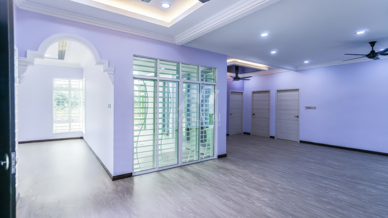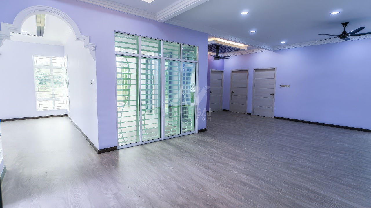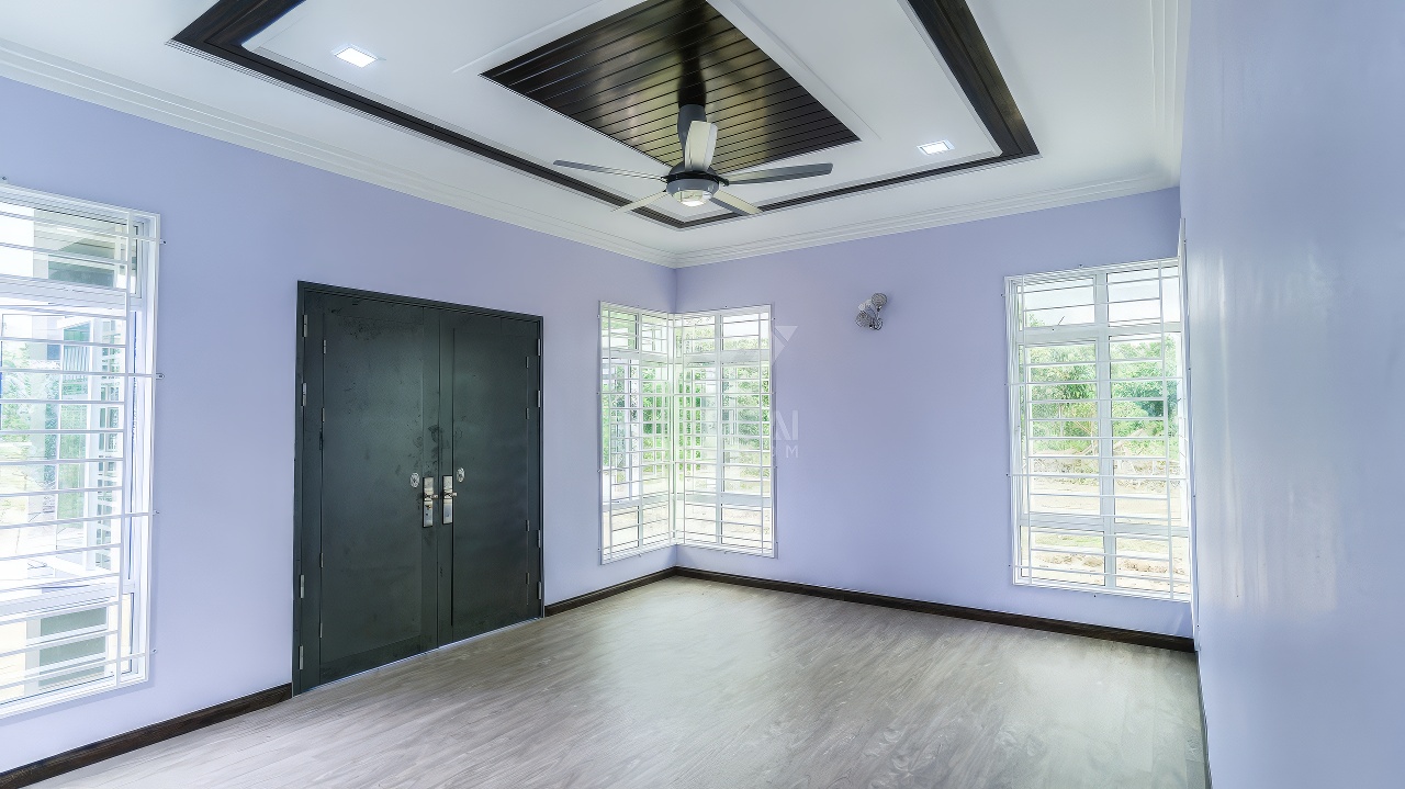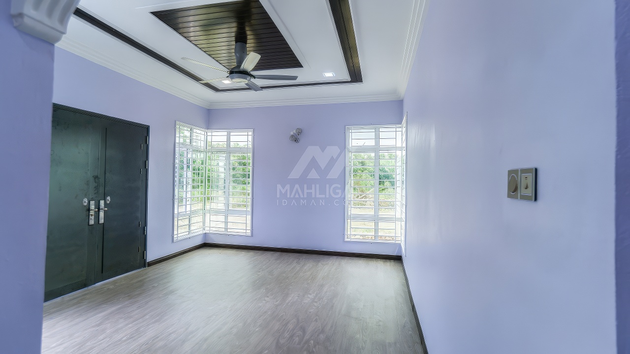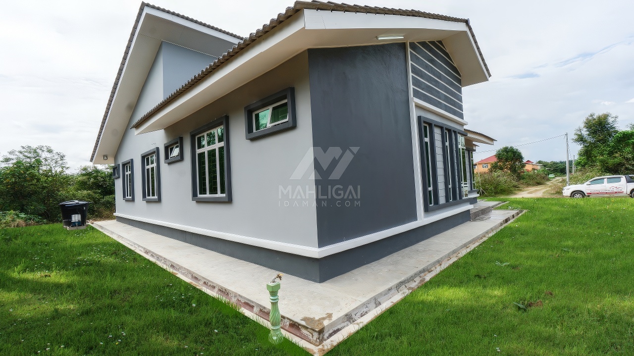 Banglo ini dibina dengan spesifikasi asas Pakej Gold dan beberapa penambahan dari sudut design seperti pemasangan shera board pada bahagian dinding dan bumbung rumah, torehan groove line pada bahagian bumbung tepi, pemasangan kayu hiasan aluminium (louvres) pada bahagian porch dan pintu masuk.