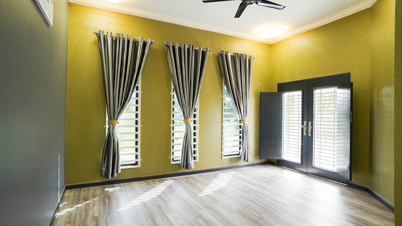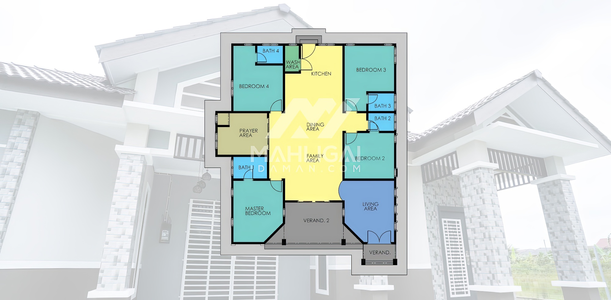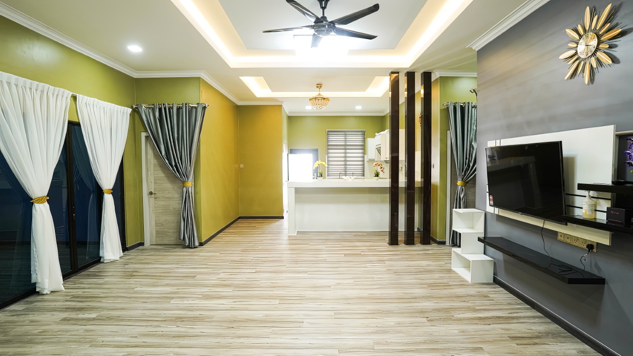 Banglo ini dibina dengan spesifikasi asas Pakej Gold dan beberapa penambahan dari sudut design seperti pemasangan kayu hiasan iaitu kayu seraya pada bahagian veranda dan pintu masuk utama, pemasangan batu hiasan pada bahagian tiang dan dinding pintu masuk utama, torehan grooveline pada bahagian bumbung dan dinding rumah serta pemasangan cornice pada bahagian tingkap dan dinding rumah.